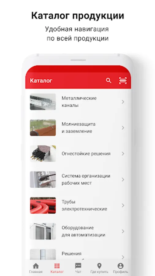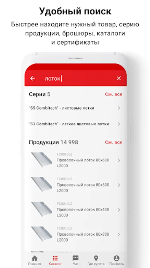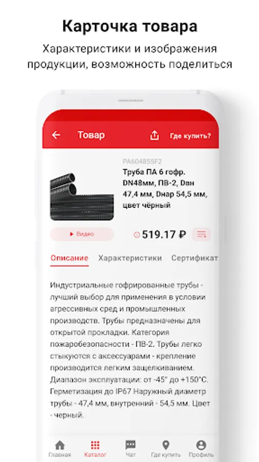 Product Catalog. Filter, sort, view detailed information about products: characteristics, certificates, drawings, catalogs, prices. Search products by barcode, code or name. Share the product link with other people.