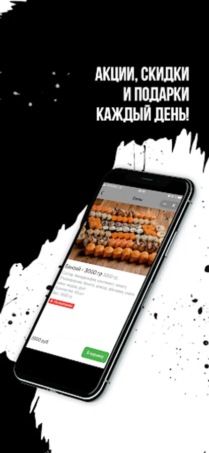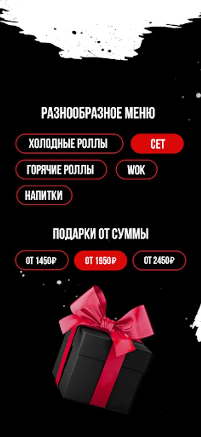 - Rolls, sushi, gunkans, wok, pizza, shawarma, salads and snacks.