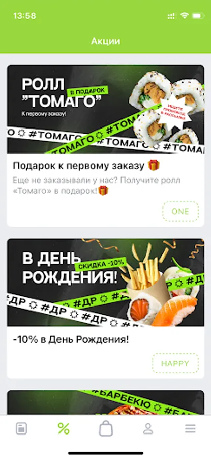 Always at hand, in the application - order history, our promotions. We will remember your delivery addresses, re-issuing will be even easier and faster!