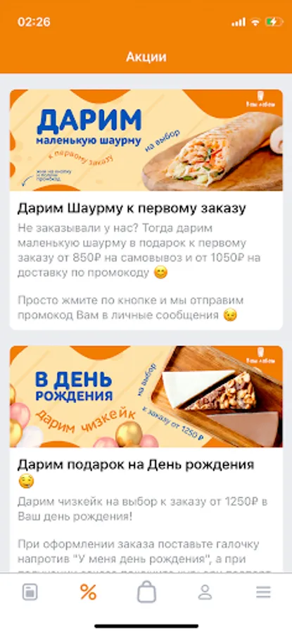 Always at hand, in the application - order history, our promotions. We will remember your delivery addresses, re-issuing will be even easier and faster!