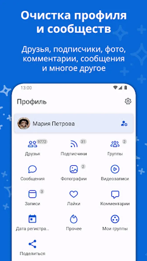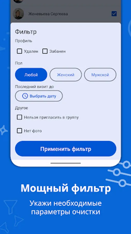 - Removing friends by filter (deleted or blocked profile, gender, last online date).