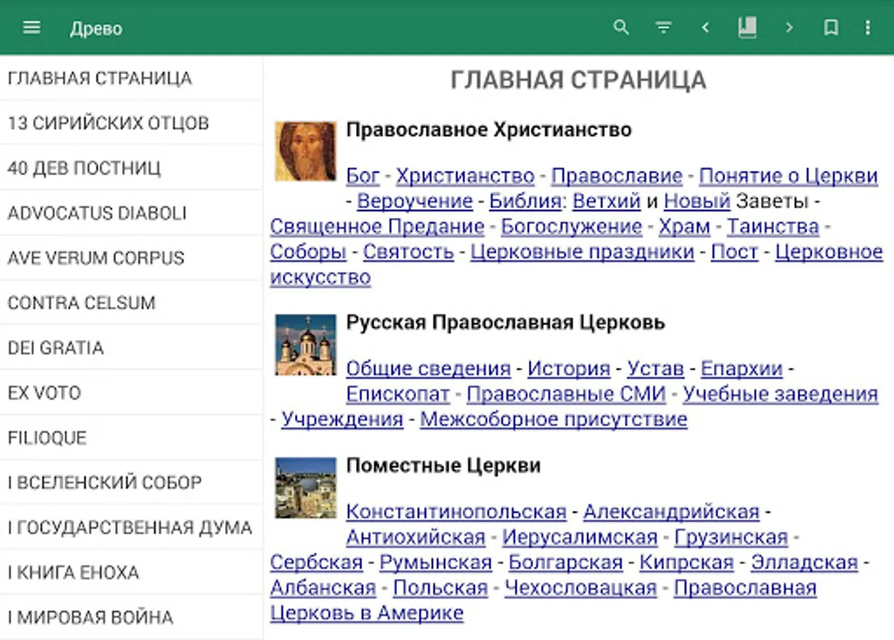 The official offline version of the open Orthodox encyclopedia "Drevo" (https://drevo-info.ru), contains more than 31 thousand articles and 19 thousand illustrations, including: