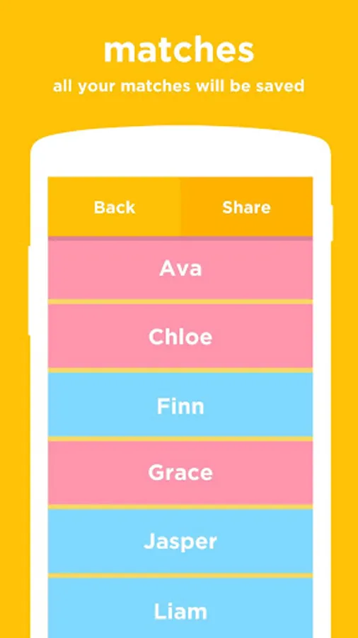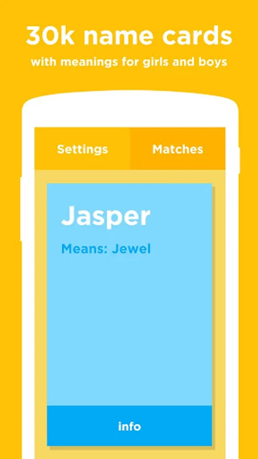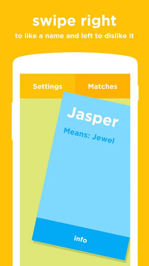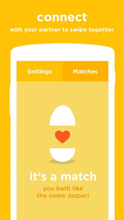 Connect with your partner and swipe through baby name cards together. If you both like the same name, it's a match and is added to your favorites list, so you'll never forget it. One name will last a lifetime.