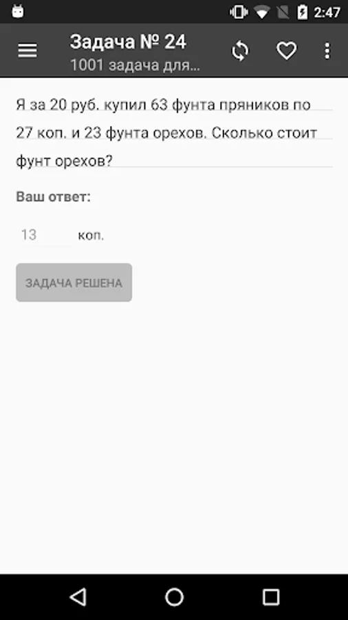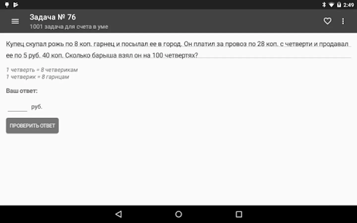 The application contains tasks from book «1001 tasks for mental calculation» by S. A. Rachinskiy.