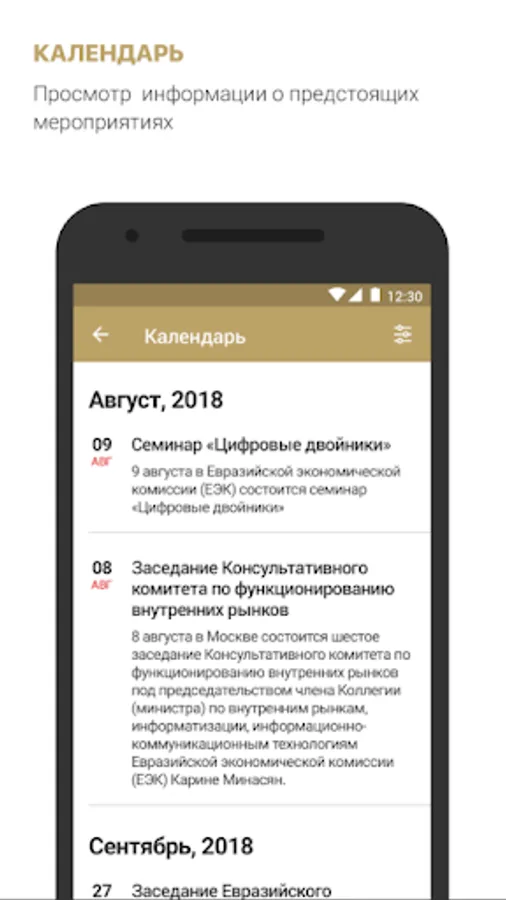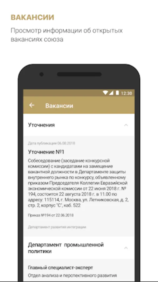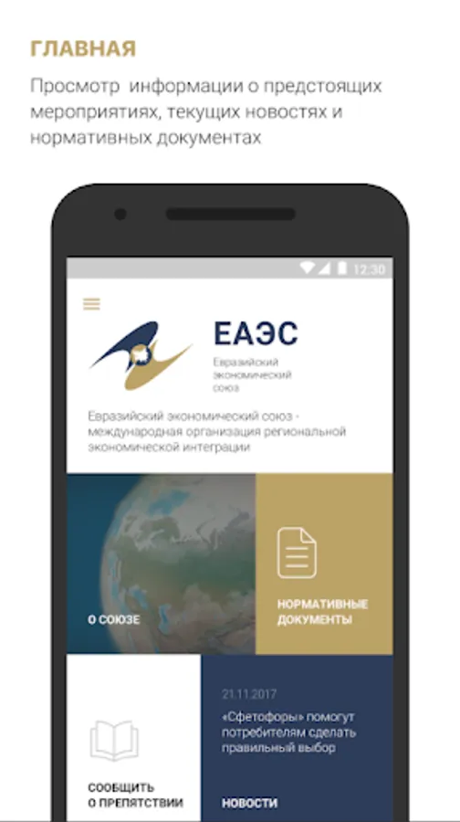 The mobile application is designed to access information from the Eurasian Economic Union (EAEU) Portal from mobile devices.