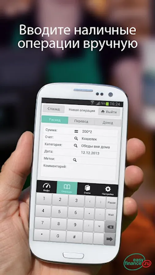 With EasyFinance.ru easily and conveniently make transactions conducted immediately after they occurred, which eliminates the possibility of forgetting or miss details. And your data is always in a straight line through the data to the server in safe hands and always accessible to you.