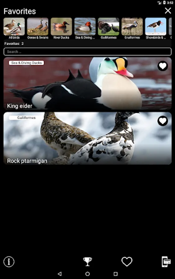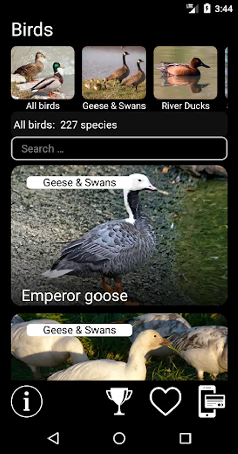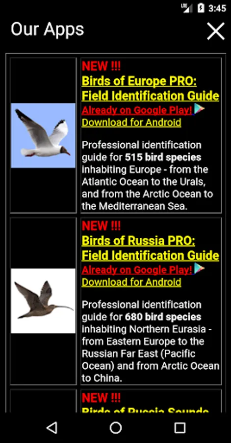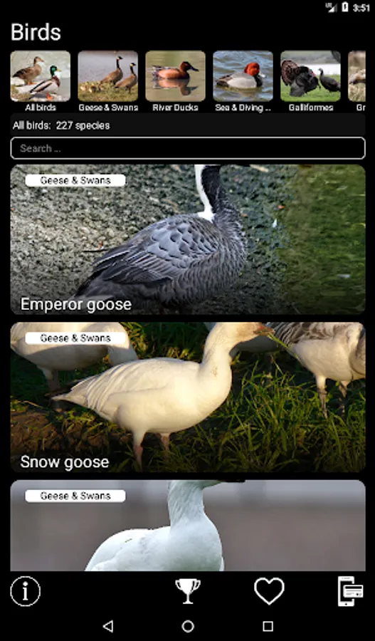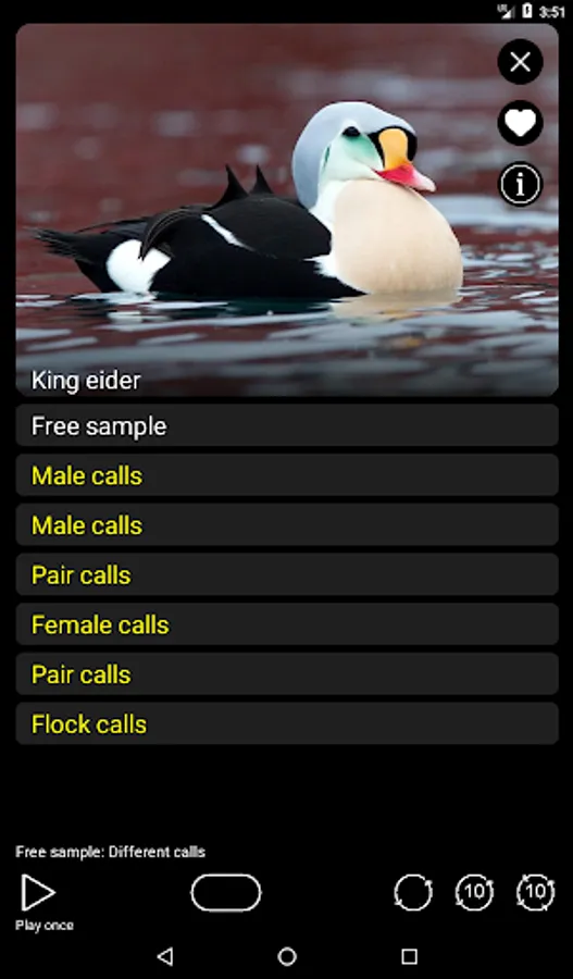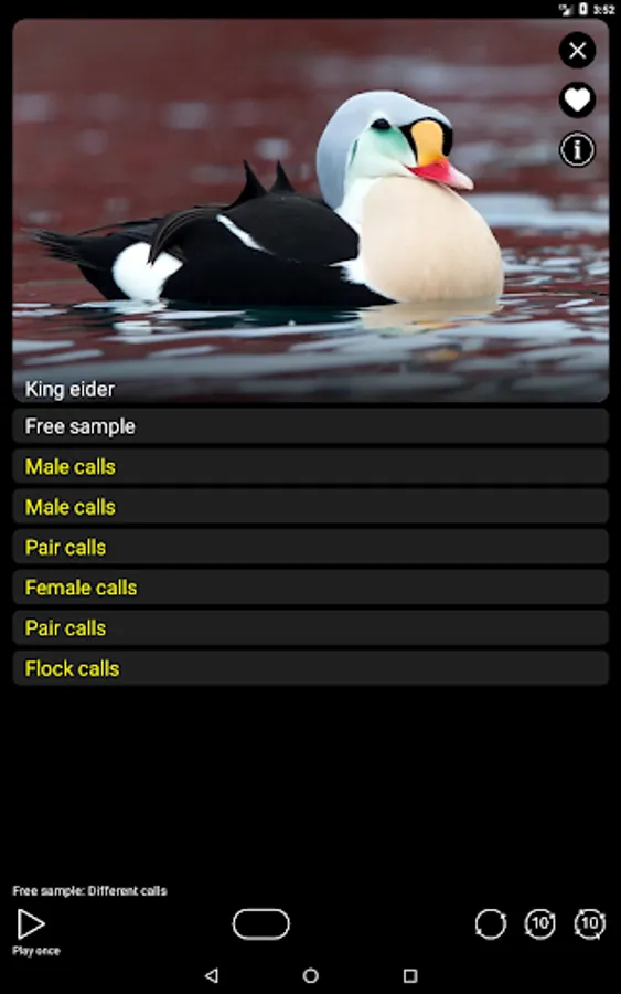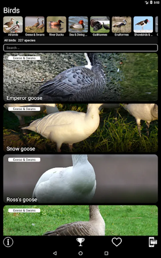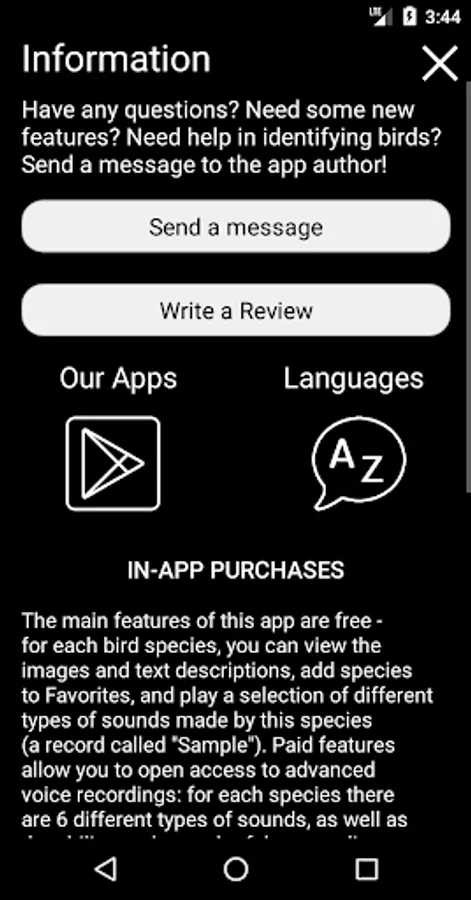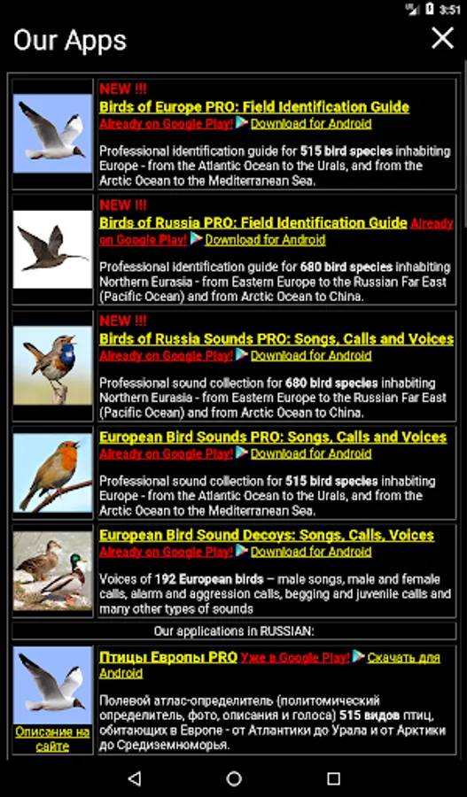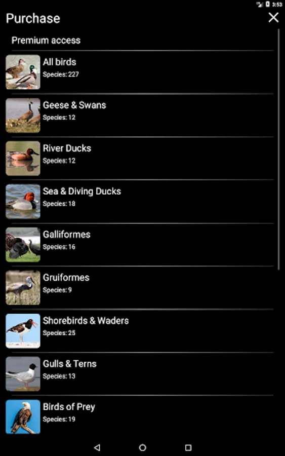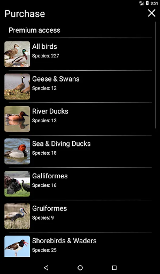 The main features of this app are free - for each bird species, you can view the images and text descriptions, add species to Favorites, and play a selection of different types of sounds made by this species (a record called "Sample"). Paid features allow you to open access to advanced voice recordings: for each species there are 6 different types of sounds, as well as the ability to play each of the recordings in four different ways. You can buy all bird species ("All Birds", $12.00), as well as any of systematic and ecological groups of birds ($2.50-4.00).