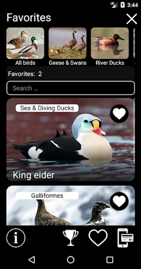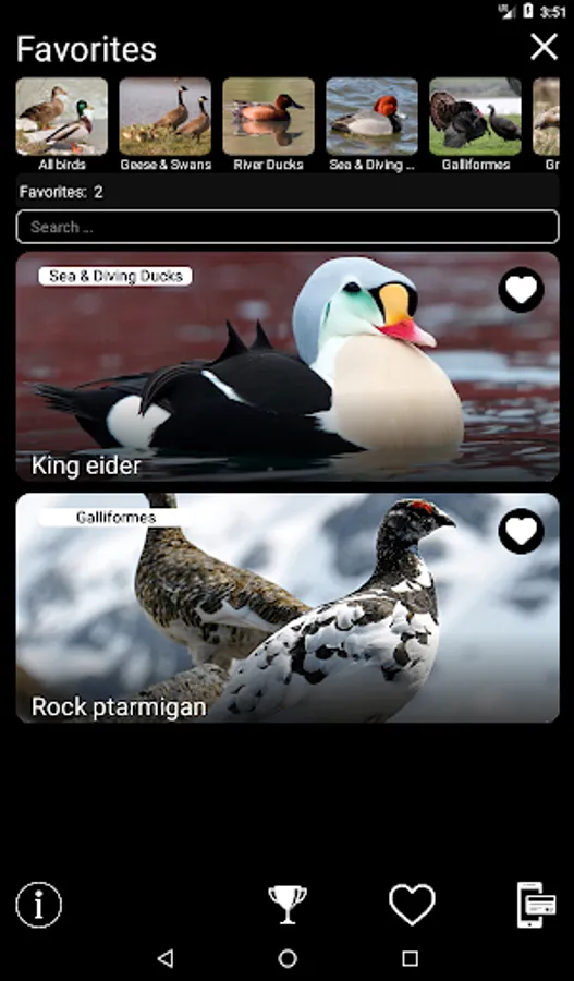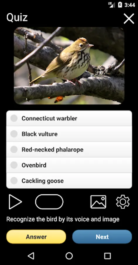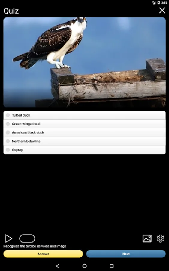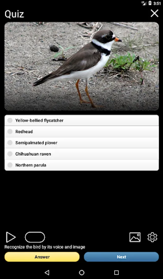 The app has a built-in Quiz, which can train you to recognize birds by their voices and appearance. You can play the quiz repeatedly – the questions for recognizing species alternate in random order and are never repeated! The difficulty of the Quiz can be adjusted – change the number of questions, change the number of answers to choose from, turn on and off bird images.