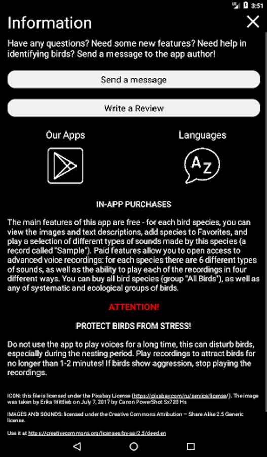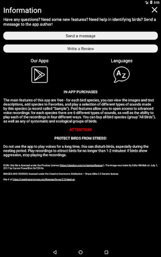 Do not use the app to play voices for a long time, this can disturb birds, especially during the nesting period. Play recordings to attract birds for no longer than 1-2 minutes! If birds show aggression, stop playing the recordings.