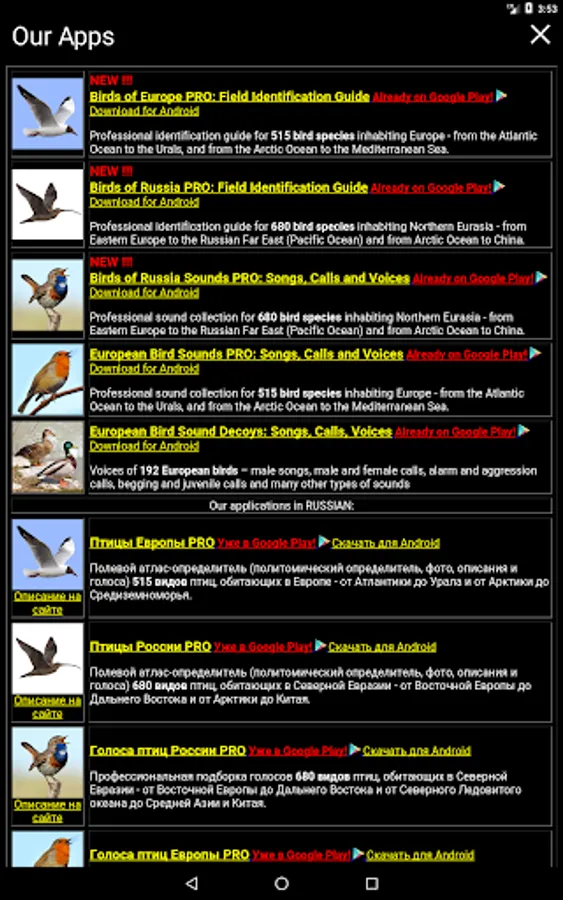 This application contains sounds recordings of 227 bird species, most common in the territory of North America (USA and Canada). The list of bird species included in the app can be found here http://ecosystema.ru/eng/apps/22manok_am.htm