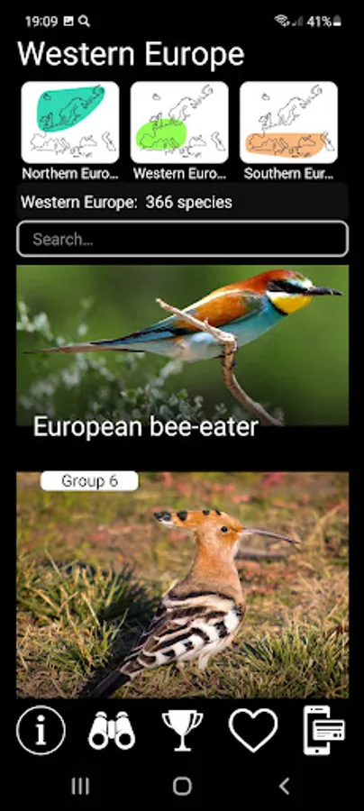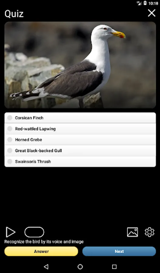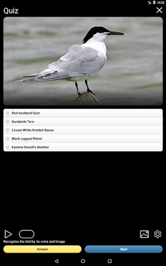 The app has a built-in Quiz, which can train you to recognize birds by their voices and appearance. You can play the quiz repeatedly – the questions for recognizing species alternate in random order and are never repeated! The difficulty of the Quiz can be adjusted – change the number of questions, change the number of answers to choose from, turn on and off bird images.