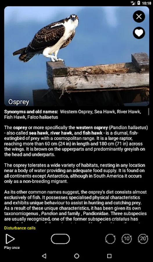 For each of 515 bird species, the app provides one combined recording, including male songs and several most typical calls – alarm, aggression, interaction, contact and flight calls, etc. Each of the recordings can be played in four different ways: 1) once, 2) in a loop without interval, 3) in a loop with an interval of 10 seconds, 4) in a loop with an interval of 20 seconds.
