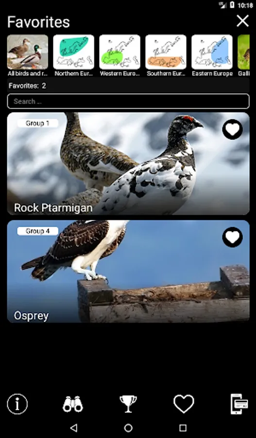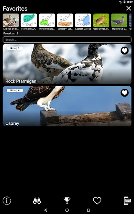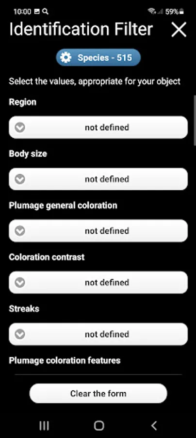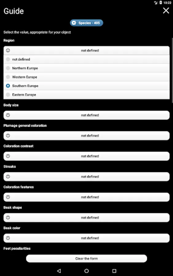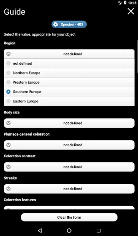 The application has a built-in polytomic Bird Identifier (Identification Filter), which helps to determine the unknown bird by 24 different features. You can select the region of Europe, the size of the bird, plumage coloration, streaks, beak and feet shape and color, distinctive features of appearance, behavior, habitats, location of a sitting bird, song and calls, daily activity, nest size, shape, construction material and location, eggs size and color. The Identifier will help you to narrow down the range of species for unknown bird.