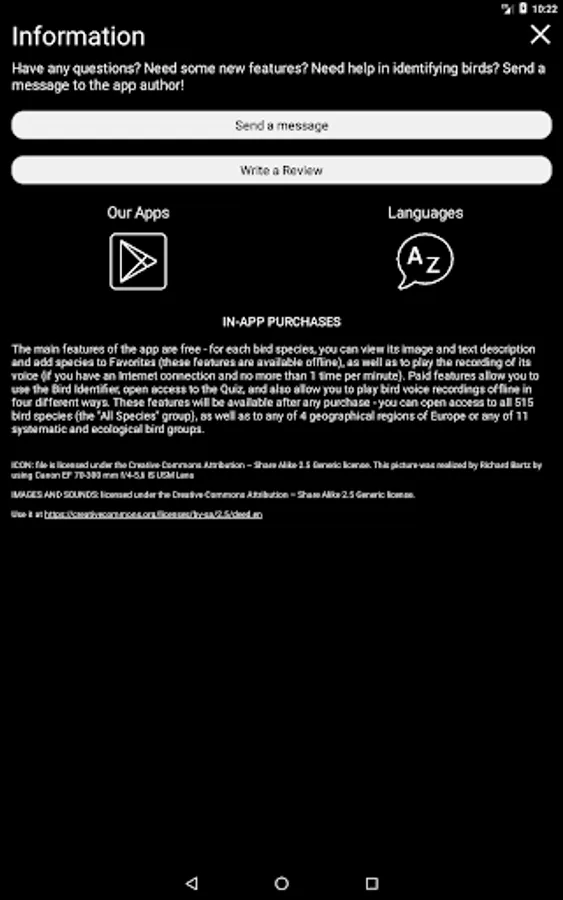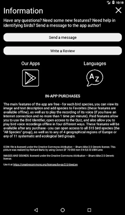 The main functions of the application are free - for each species of bird, you can view its image and text description and add species to Favorites (these functions are available offline), as well as play a recording of its voice (if you have an Internet connection and no more than 1 time per minute). Paid functions allow unlimited use of the Identification Filter and Quiz, open access to additional color images, and also make it possible to play all recordings of bird voices offline. You can purchase access to all bird species (the "All Birds" group, $12.00), as well as to any geographical ($7.00) or systematic ($2.50) group of birds.