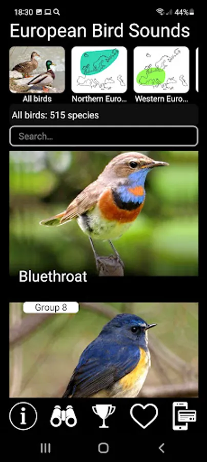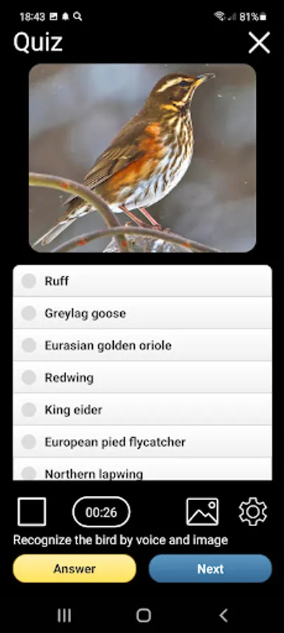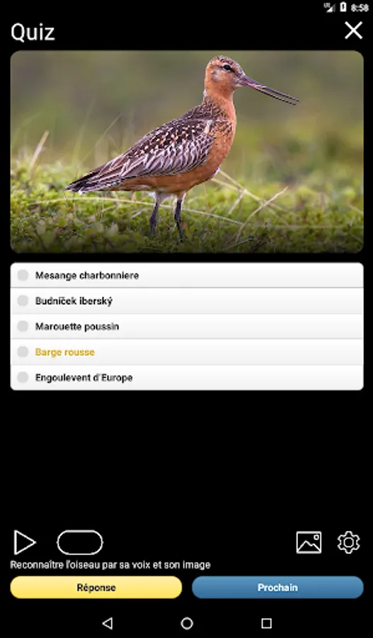 The app has a built-in Quiz, which can train you to recognize birds by their voices and appearance. You can play the quiz repeatedly – the questions for recognizing species alternate in random order and are never repeated! The difficulty of the Quiz can be adjusted – change the number of questions, change the number of answers to choose from, turn on and off bird images.