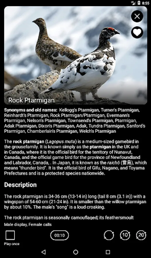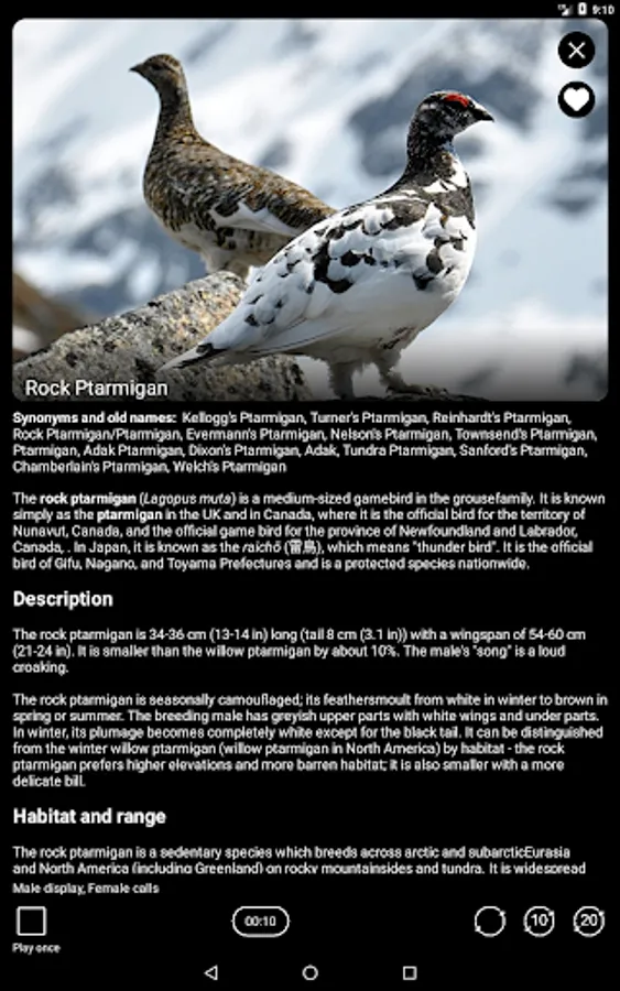For each of the 515 bird species, the app provides one combined recording, including male songs and several most typical calls – alarm, aggression, interaction, contact and flight calls, etc. Each of the recordings can be played in four different ways: 1) once, 2) in a loop without interval, 3) in a loop with an interval of 10 seconds, 4) in a loop with an interval of 20 seconds.