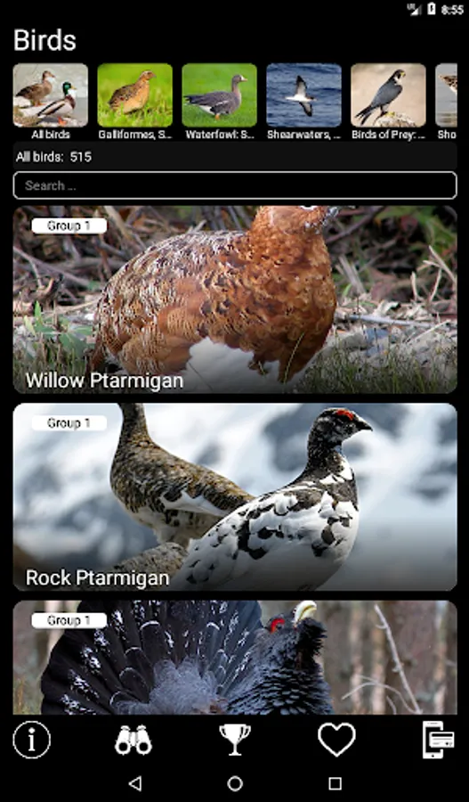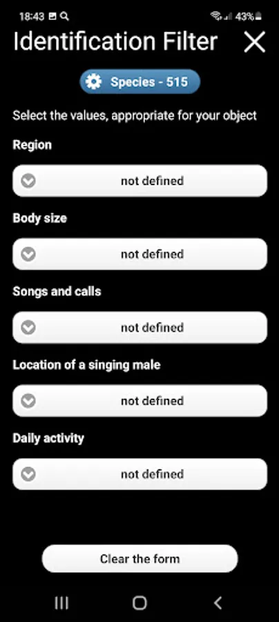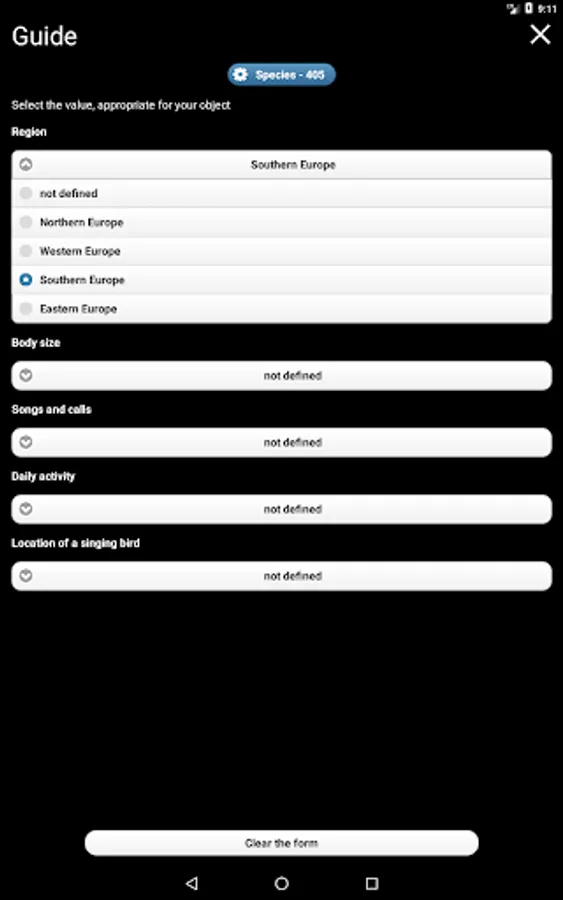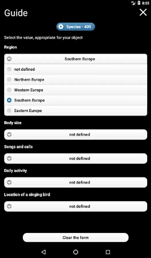 The application has a built-in polytomic bird Voice Identifier (Identification Filter), which helps to determine the unknown bird by its appearance and voice. You can select the geographical region, the size of the bird, the location of the singing bird, the type of sound signal, and the time of a day. The Identifier will help you to narrow down the range of species for unknown bird.