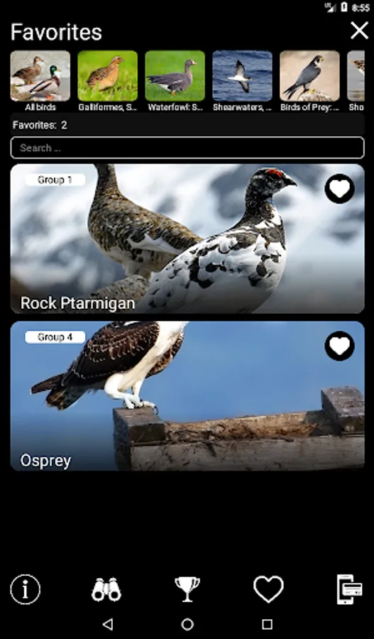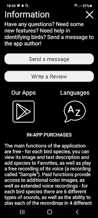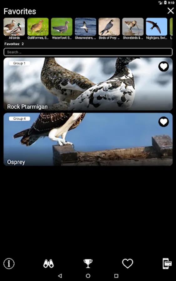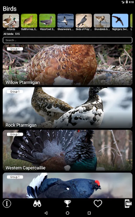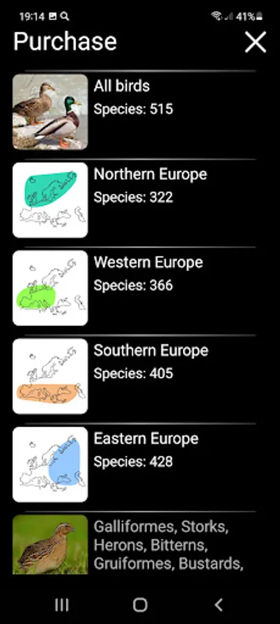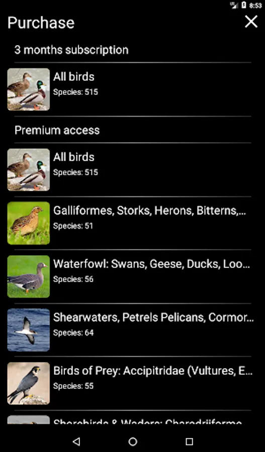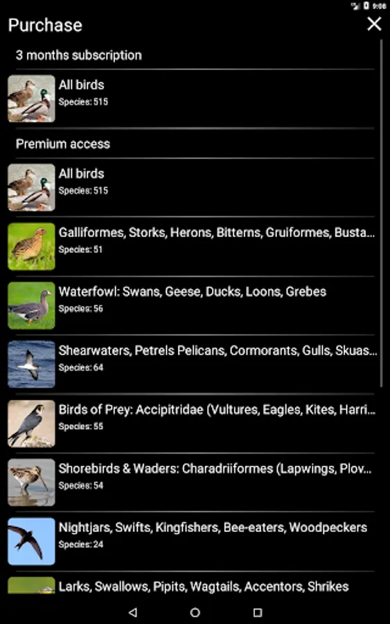 The main functions of the application are free - for each species of bird, you can view its image and text description and add species to Favorites (these functions are available offline), as well as play a recording of its voice (if you have an Internet connection and no more than 1 time per minute). Paid functions allow unlimited use of the Identification Filter and Quiz, open access to additional color images, and also make it possible to play all recordings of bird voices offline. You can purchase access to all bird species (the "All Birds" group, $12.00), as well as to any geographical ($7.00) or systematic ($2.50) group of birds.