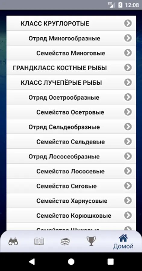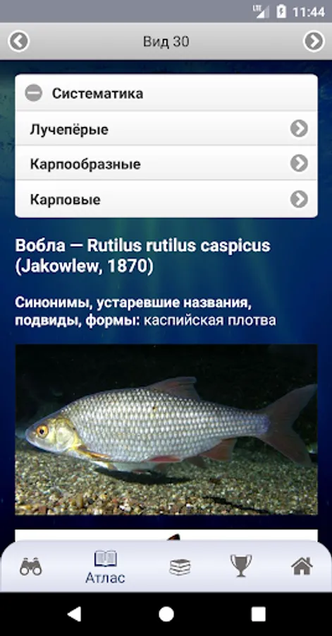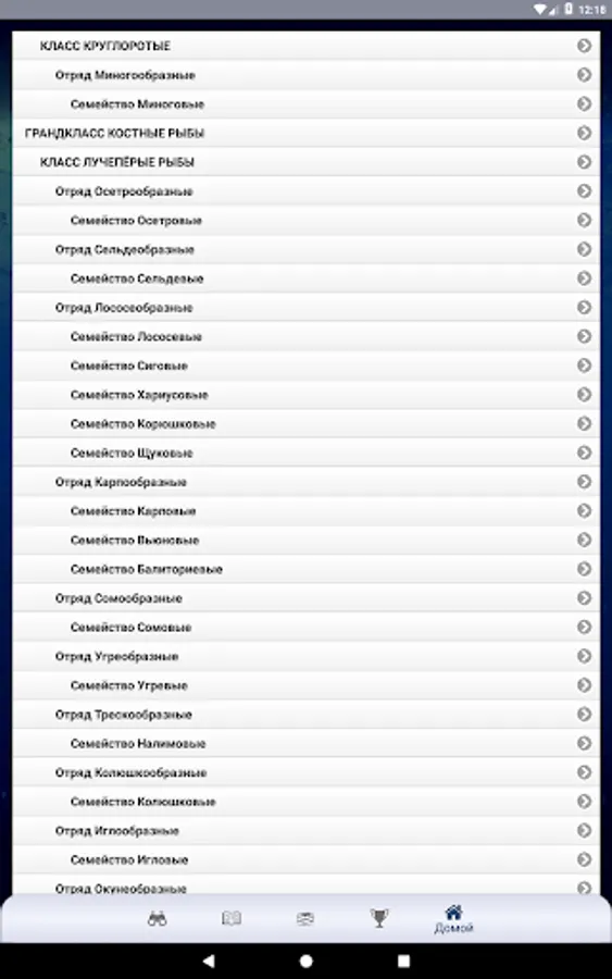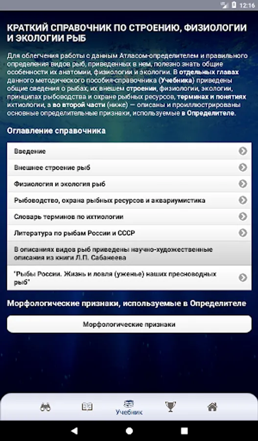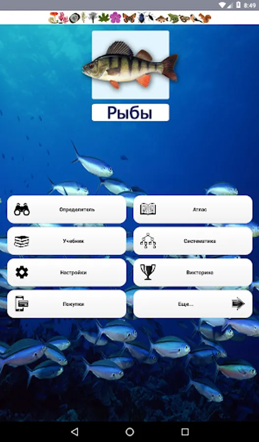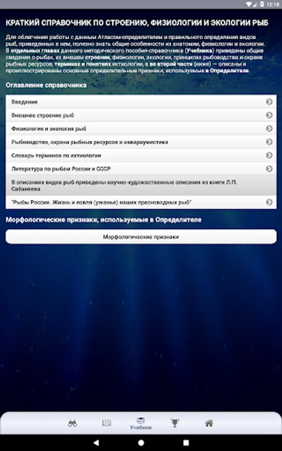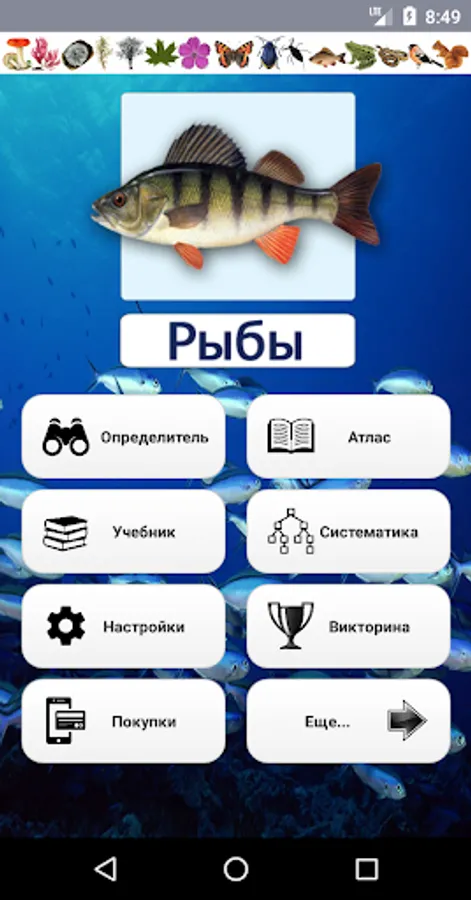 Application consists from 6 main parts: Guide, Atlas, Textbook, Manual, Systematic Tree (with class, family and genus descriptions) and Quiz.