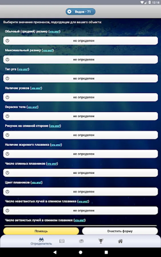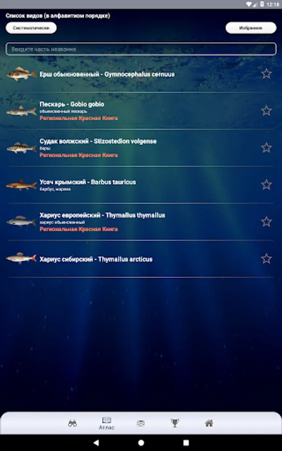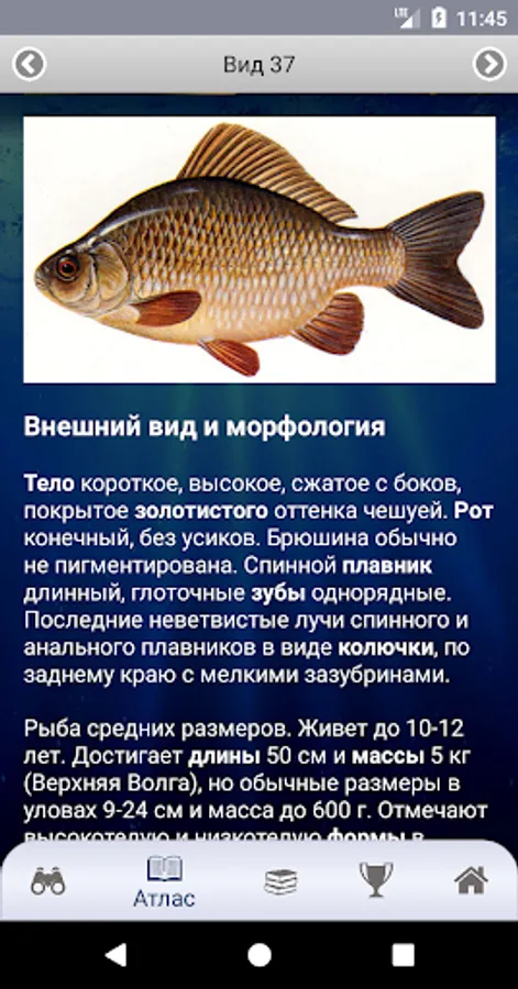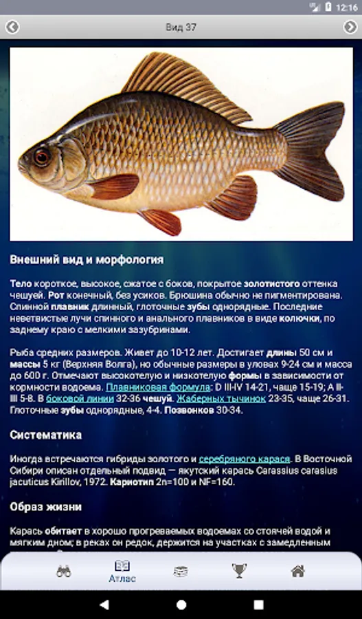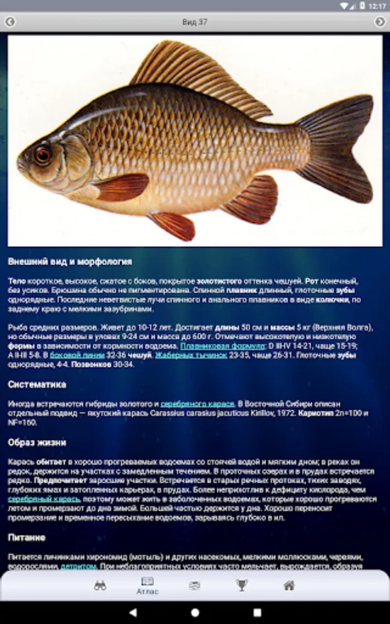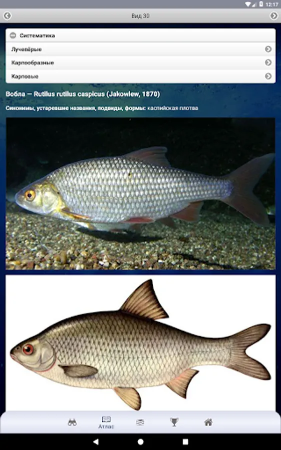 Unique, first in Russia FIELD mobile guide to the freshwater and anadrom fish of Northern Eurasia: 76 most prevalent species, each with photo and drawing of male and female (if different), typical identification features and text descriptions of their appearance, habitats, reproduction time and characteristics, feeding, way of life, differences from similar species, economic value and conservation status. It is easy and fun to identify species using 16 determination morphological and ecological characters with 5-10 values in each of them.