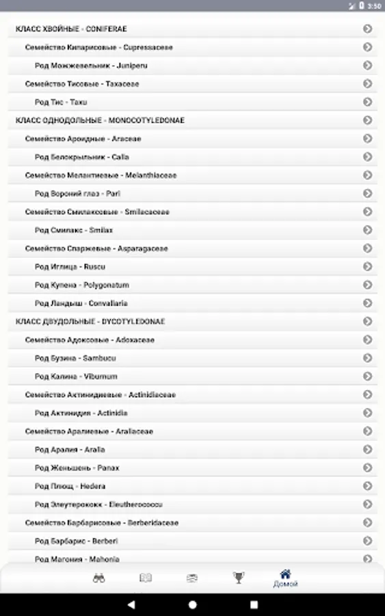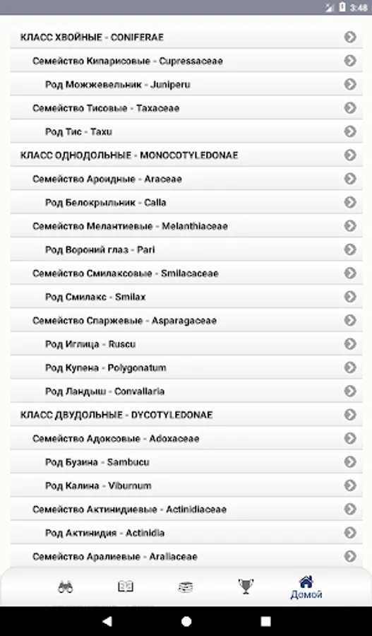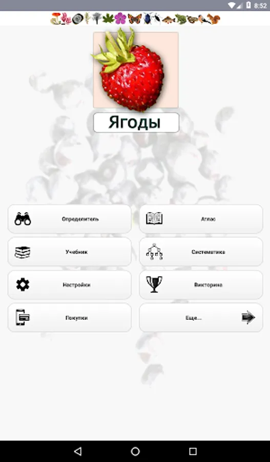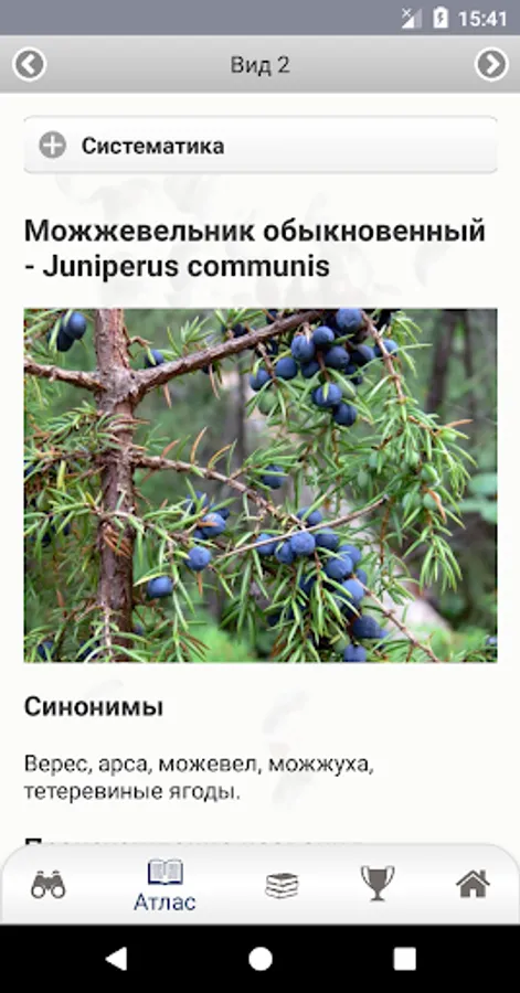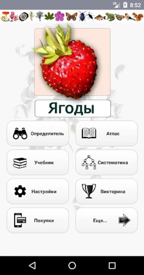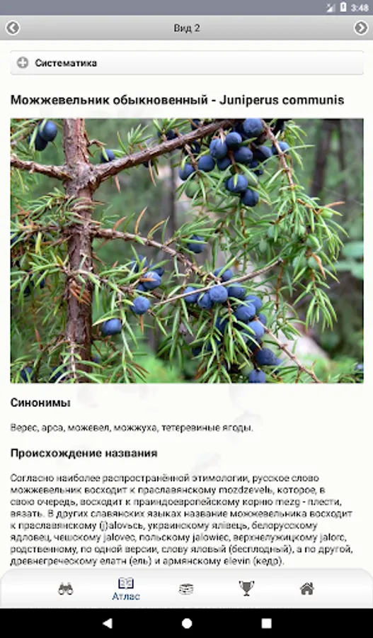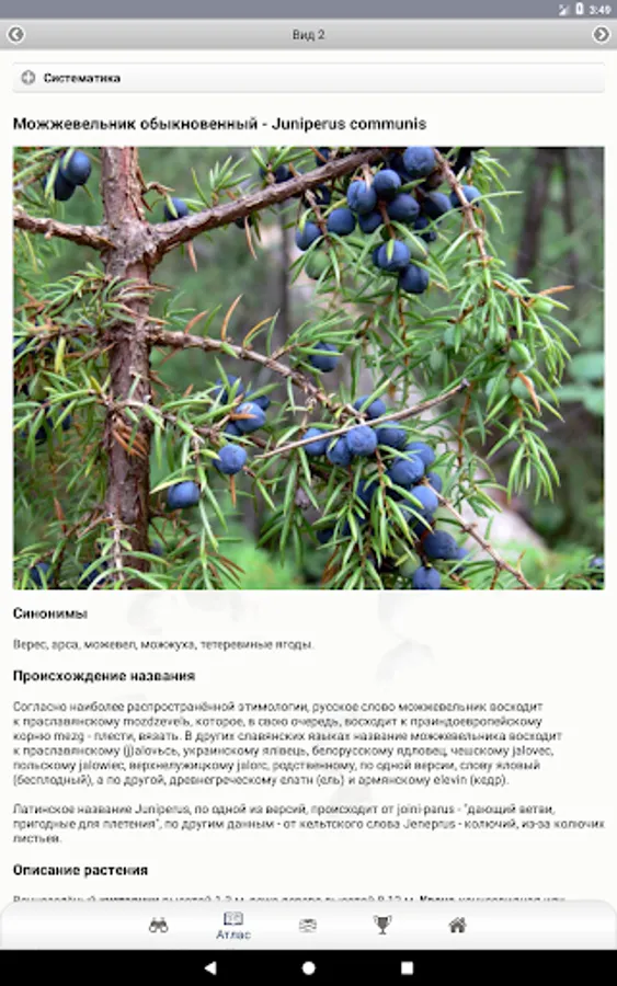 Application consists from 5 main parts: Guide, Atlas, Manual, Systematic Tree (with class, family and genus descriptions) and Quiz.