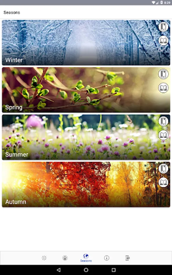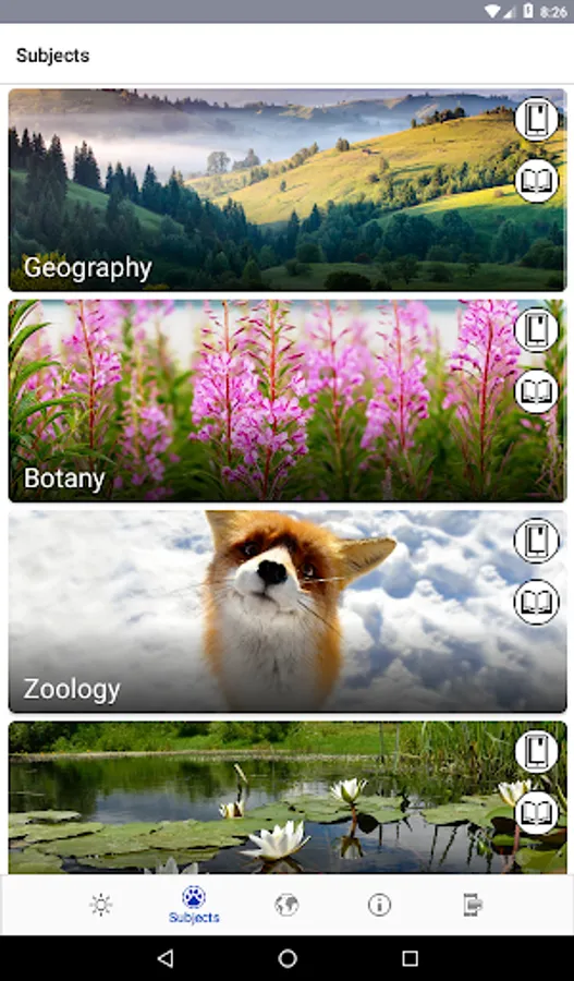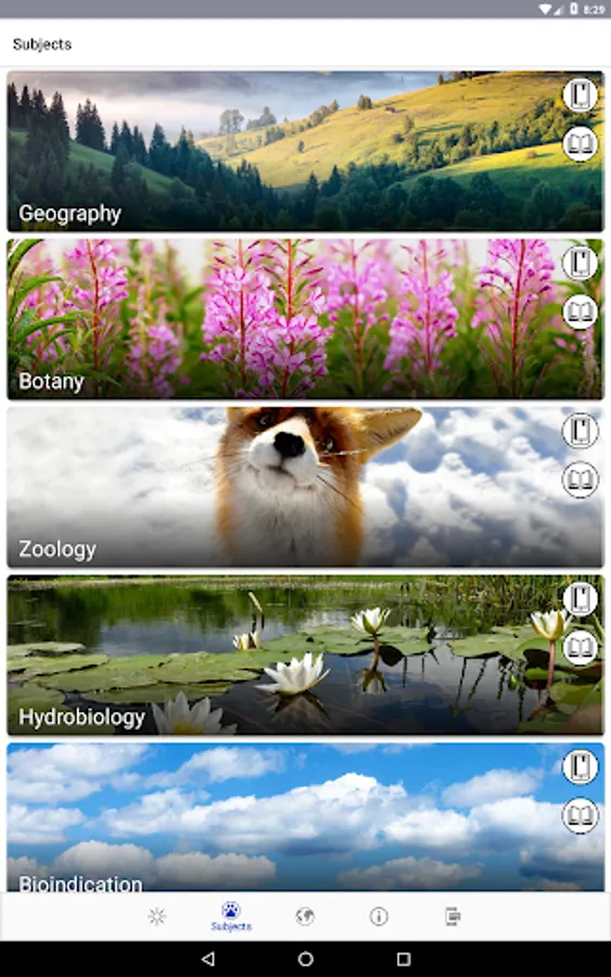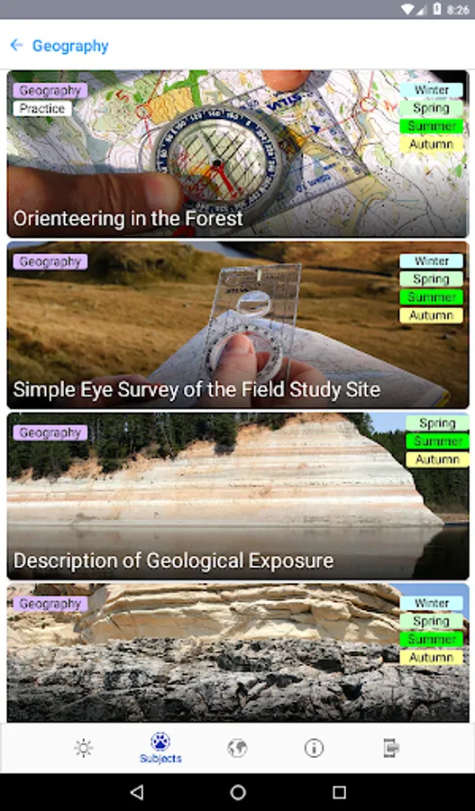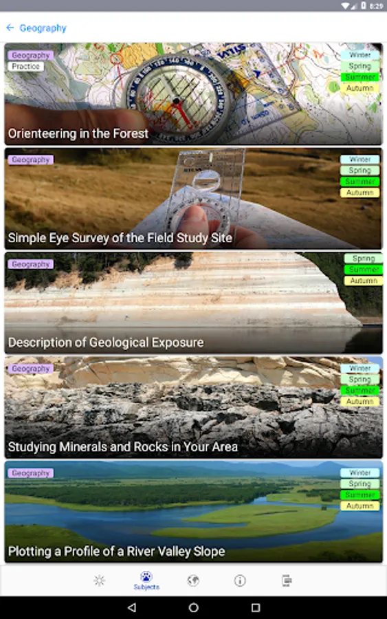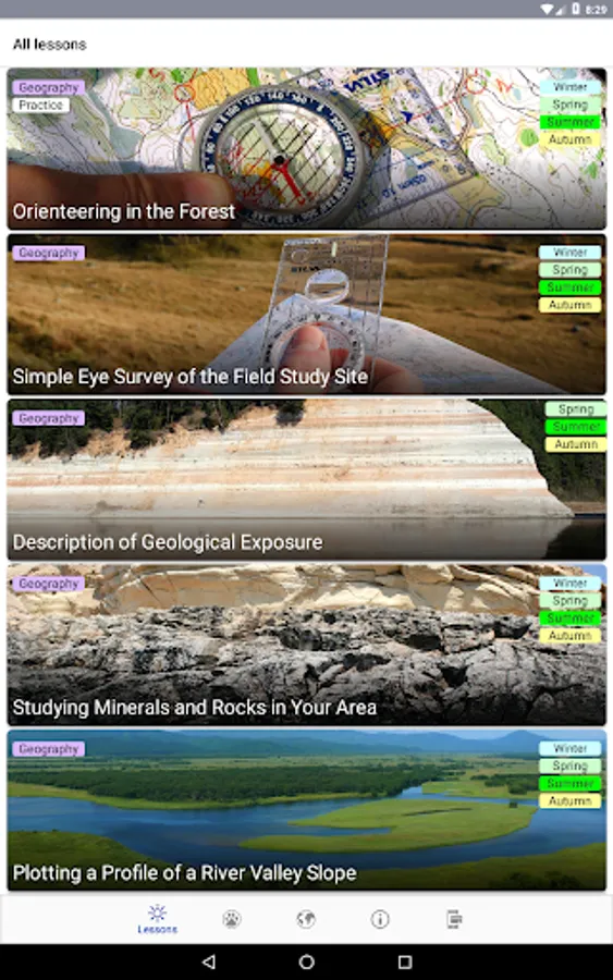 It includes 40 environmental study lessons (see below) divided by four seasons (Autumn, Winter, Spring and Summer) and covered a wide variety of activities in nature. These activities (lessons) focus on five main themes (subjects) - landscape, botany, zoology, water ecology and environmental monitoring.