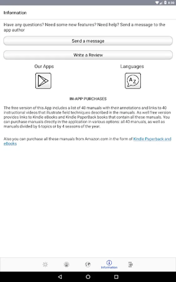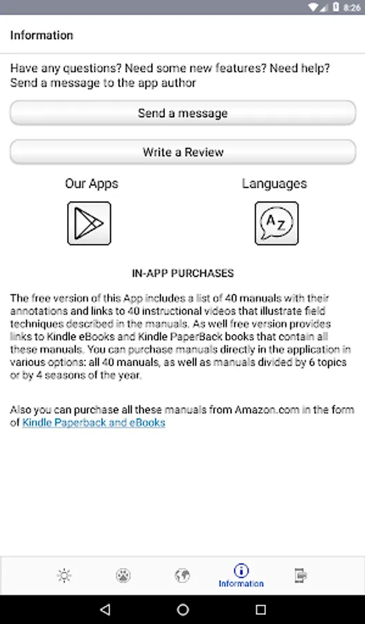 The free version of this App includes a list of 40 manuals with their annotations and links to 40 instructional videos that illustrate field techniques described in the manuals. As well free version provides links to Kindle eBooks and Kindle Paperback books that contain all these manuals (https://www.amazon.com/Alexander-Bogolyubov/e/B082RYY9TG/). You can purchase manuals directly in the application in various options: all 40 manuals ($8.99), as well as manuals divided by 6 topics ($3.99) or by 4 seasons of the year ($6,99).