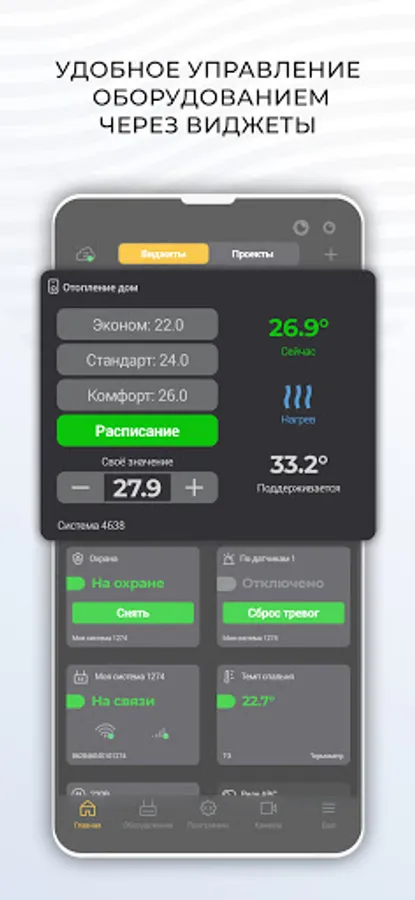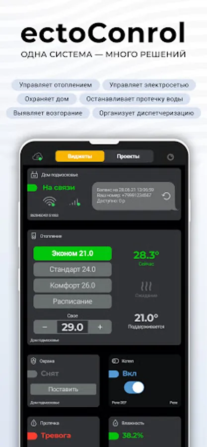 Track the alarms of smoke, flame, gas, motion, water leakage and many other sensors, notifying about it in a timely manner via SMS and voice calls. Need to maintain the required temperature? Need to know if the house is freezing? Are you leaving and want to put your house under protection? EctoControl can handle it! At your disposal are wired and wireless sensors, smart wired and radio sockets, automatic emergency water shutoff taps and much more! It is enough to insert a SIM card of any mobile operator - and the EctoControl system is already in touch. Do you have WiFi? The system will go online without a mobile operator and save your money!
