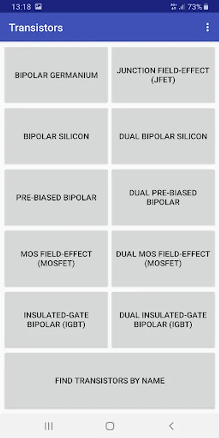 The directory contains all the main categories of transistors: bipolar silicon and germanium transistors, pre-biased bipolar transistors, junction and metal-oxide-semiconductor field effect transistors (MOSFET), insulated-gate bipolar transistors (IGBT). There are also transistor assemblies: dual bipolar transistor, dual pre-biased bipolar transistors, dual-channel mos-field effect transistors (MOSFET) and dual-channel insulated-gate bipolar transistors (IGBT).