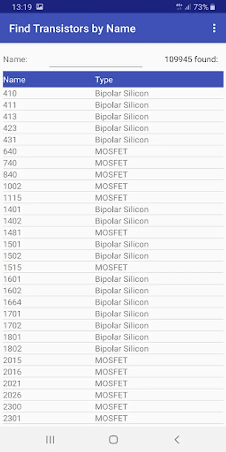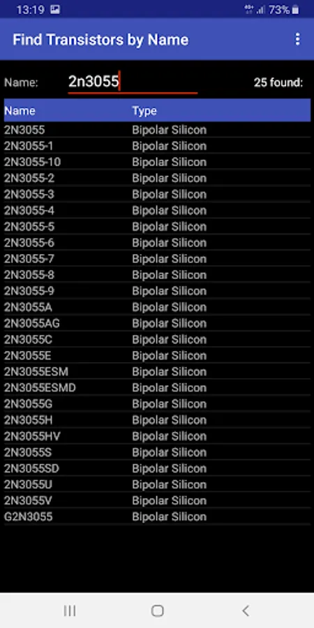 The directory provides two ways to search for transistors in the database - by parameters and by name. Search by name is convenient if you have a transistor and need to find out its characteristics. To do this, you need to type characters from the name of the transistor, while the table below will immediately display those transistors, in the name of which there is this sequence of characters.