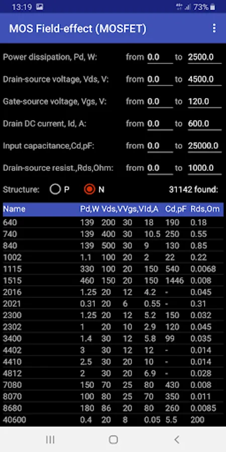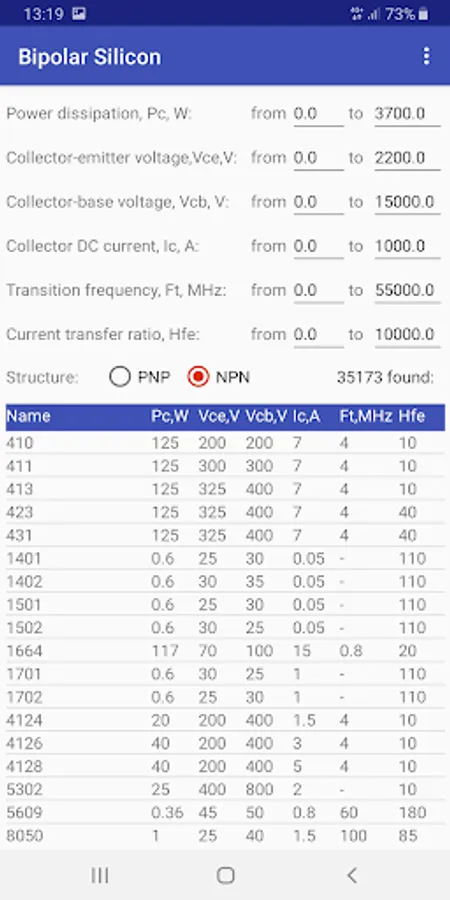 To search for parameters, first select the appropriate category of transistors. Then you specify the ranges of values of the necessary parameters for the selected type of transistors. Transistors that meet the specified parameters will also be displayed in the table below.