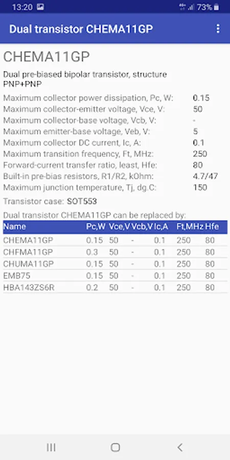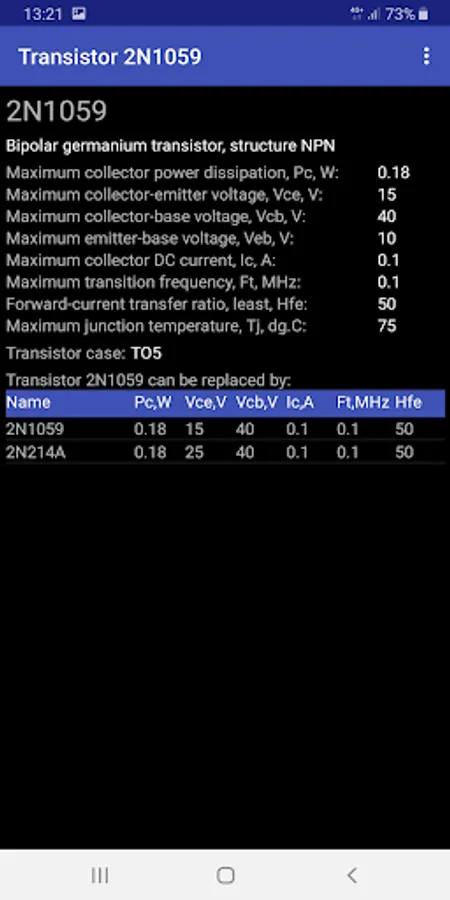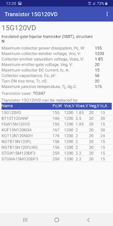 By clicking on one of the lines, you can open a page with a detailed description of the selected transistor. In the description, in addition to the parameters for selection, all the parameters of the transistor from the reference database will be presented. In addition, the following suggested replacement for this transistor and other transistors, the main parameters of which are not worse or slightly better.