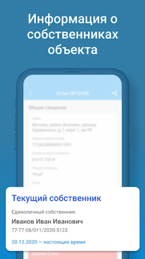 • Complete information about the object - information about the change of ownership, about the current owner, the date of registration and termination of rights, about the pledge, the ban on re-registration, the cadastral value.