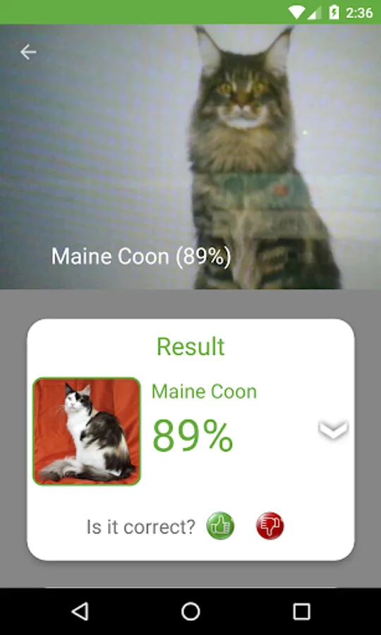 The system is trained to recognize 62 cat breeds from 13,000 photographs. In this version of the application, the accuracy of recognition of cat breeds was 63% on 2 thousand photos from the test sample (not used in training the classifier) and 86% on all available photos. The training database of cat photos is being supplemented and improved, so the number of breeds and the quality of their recognition will increase in new releases.