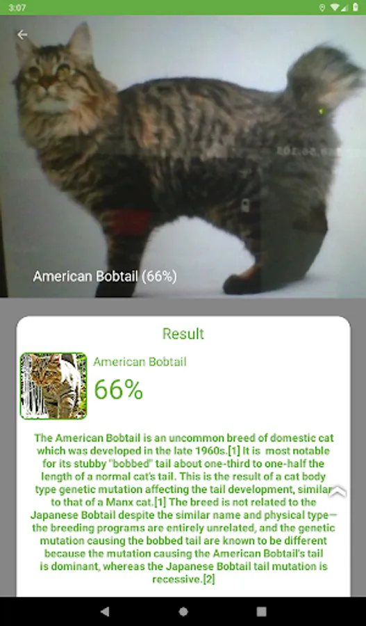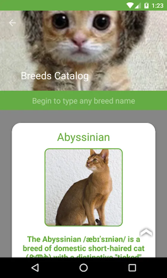 It specifies the breed of cat by pictures using your device's camera or image gallery.