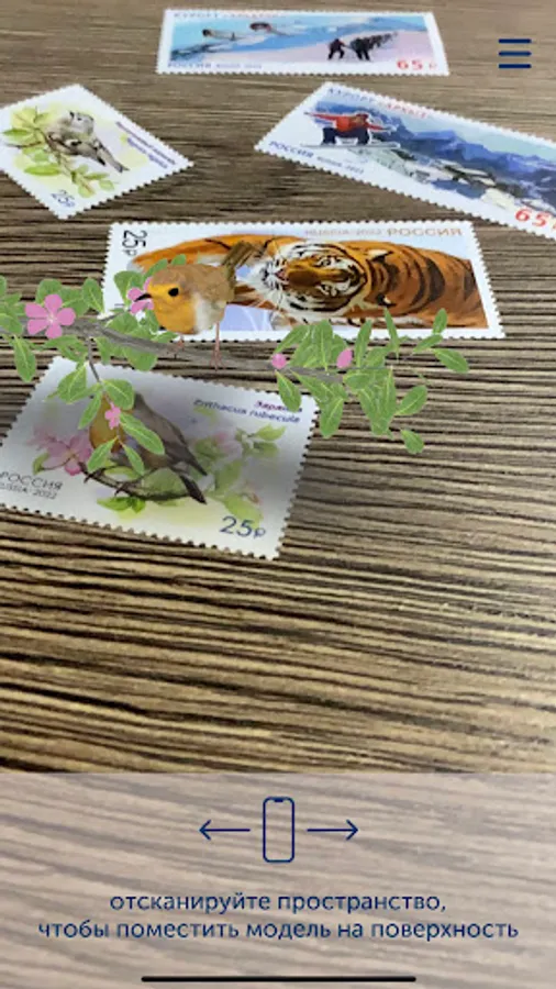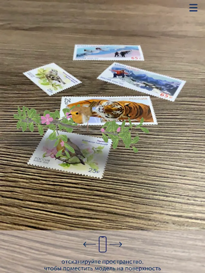 To view stamps in AR mode, allow the application to access the camera of your device - smartphone or tablet. Point your device's camera at the brand (or its image on the screen of another device) and follow the prompts on the screen.