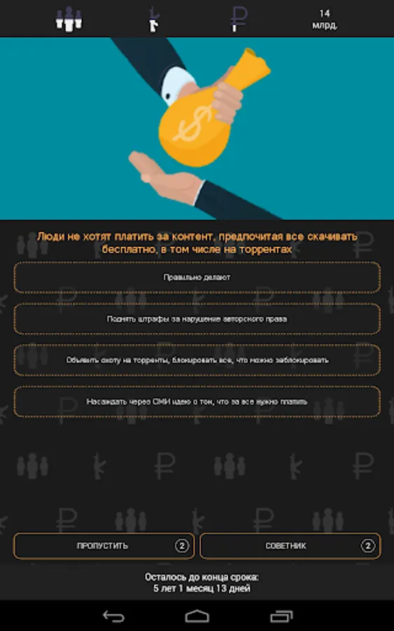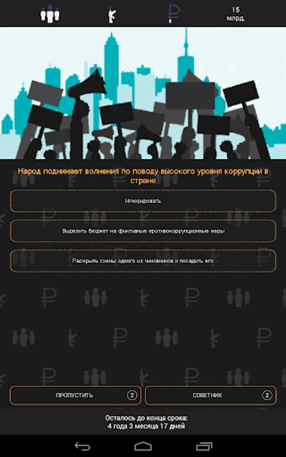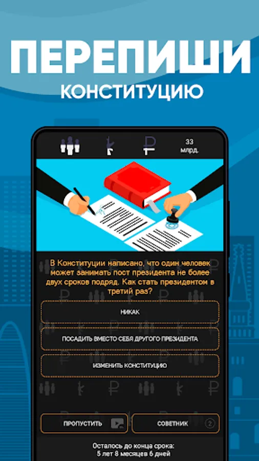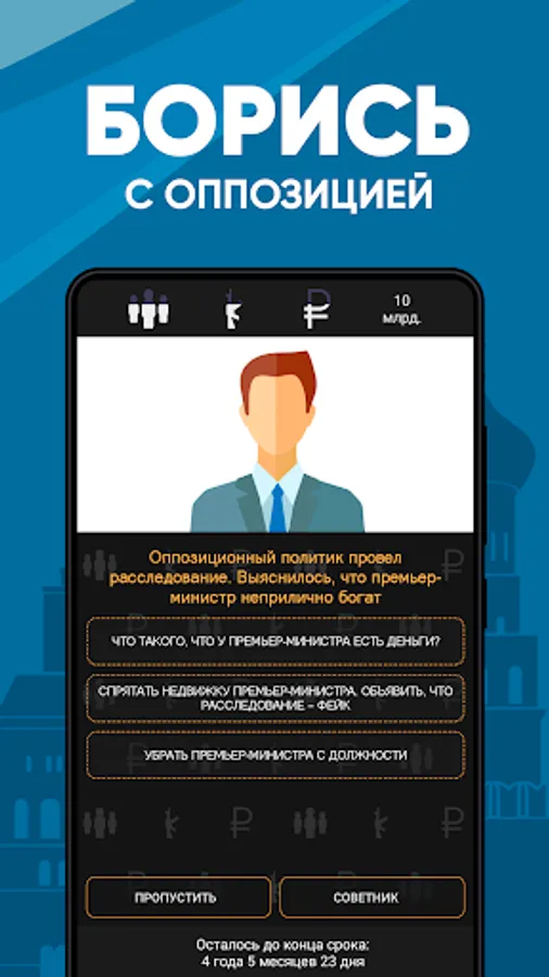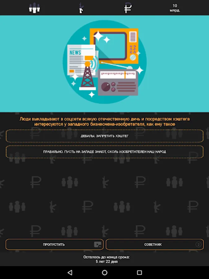The goal of the game is simple. Various situations arise in the country and only you can choose how to react to them. A rally in the capital? Lure protesters to free barbecue in the park or arrange a concert. Can't get out again? Rewrite the constitution. Shook off. Just follow the indicators, otherwise the people will arrange a revolution or neighbors will conquer the country.