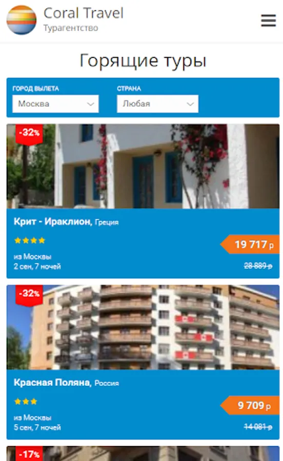 Search for hot tours from Coral Travel leading tour operator, rest for every taste, last minute trips to 5 * hotels at the best prices with the ability to compare and pay tours online.