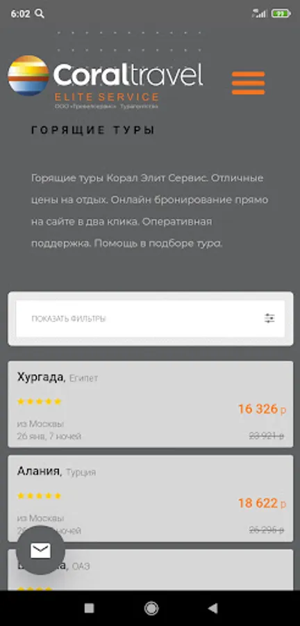 Coral Travel Elite vacation - search for tours ONLINE, you can also write to a free manager on WhatsApp if you need advice on the tour. Book tours in two clicks and without registration. Prices in the search for tours are current, taking into account all surcharges!