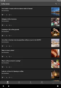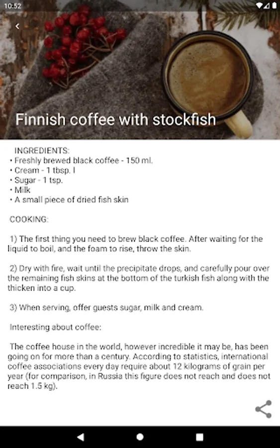 This application contains the best unusual recipes for making coffee and coffee cocktails, as well as recipes for making coffee cakes, cookies, ice cream and much more! And while you are drinking your delicious coffee, you can read interesting stories, find out which coffee is the most expensive and when the fashion for it first appeared!