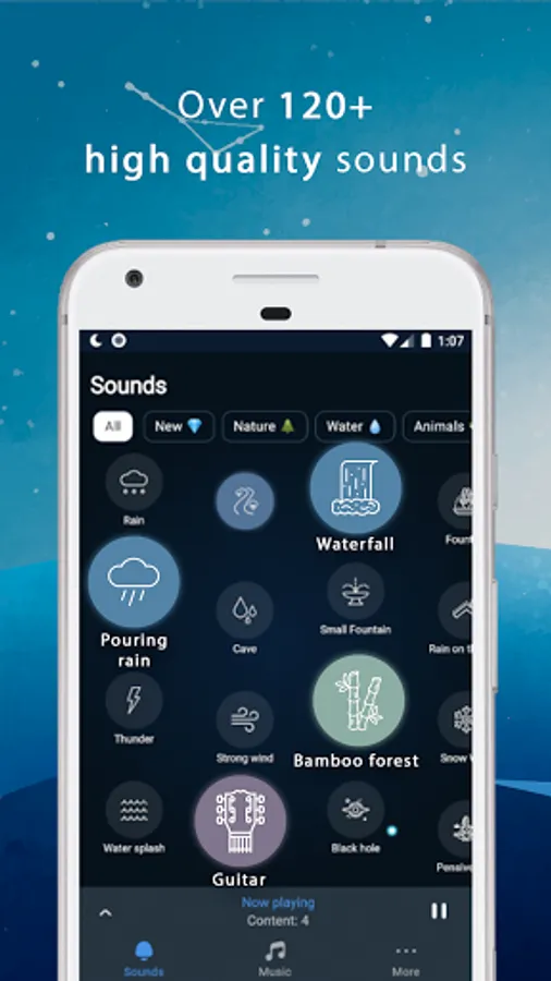 According to studies, scientists have found that the sounds of nature positively affect the human psyche. Thanks to Sleeps, you can defeat insomnia, nighttime anxiety and tinnitus.