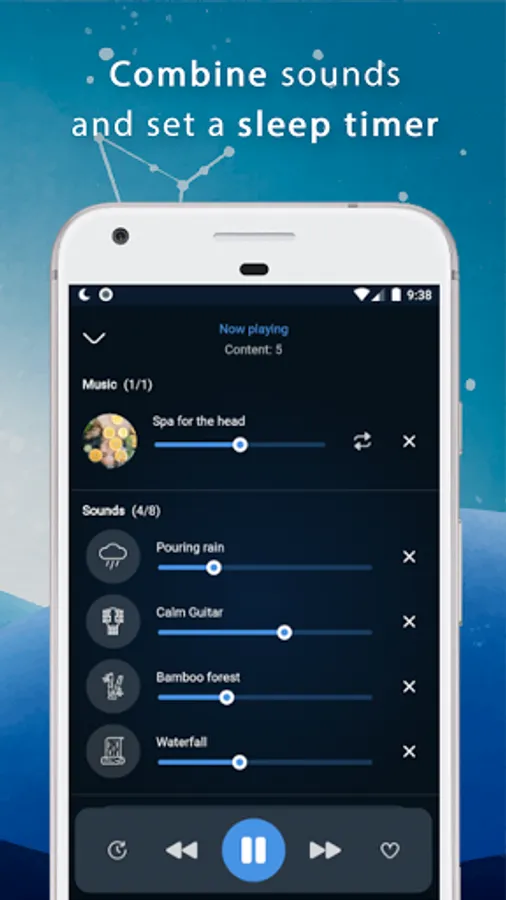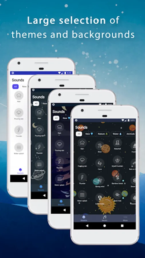 Give yourself a healthy sleep, relax and fall asleep to soothing sleep melodies: rain, water, wind, sea surf and many others. Create your own combinations of the sounds of nature, the city for relaxation and quiet sleep.