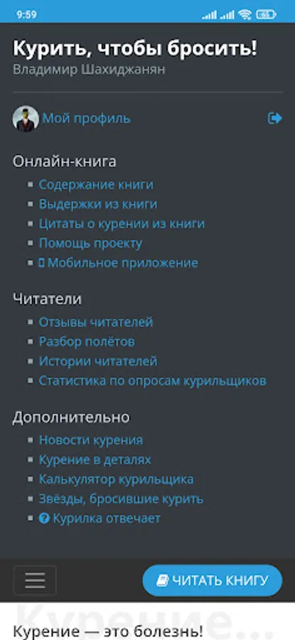 The official application of Vladimir Shakhidzhanyan's free online book "Smoking to Quit!" - an Internet bestseller for those who have set a goal to stop smoking: