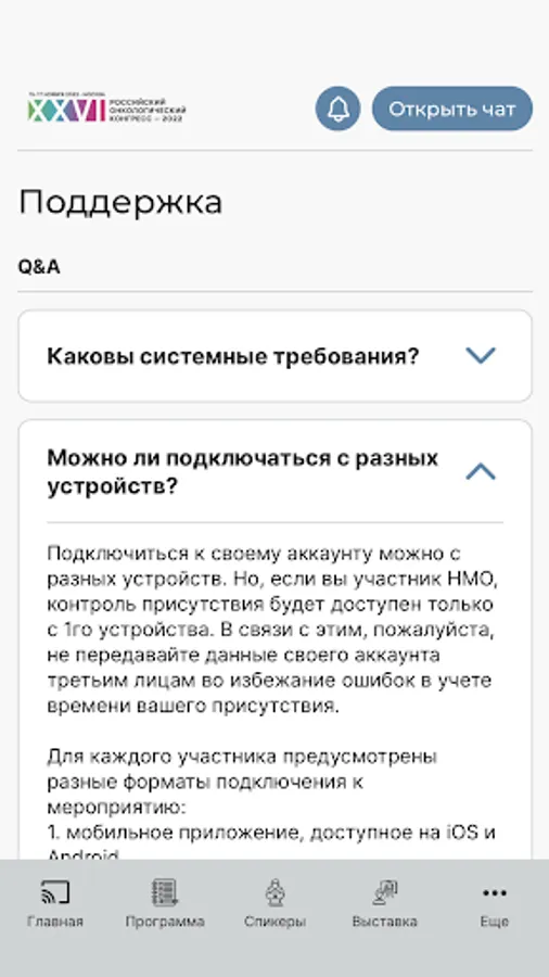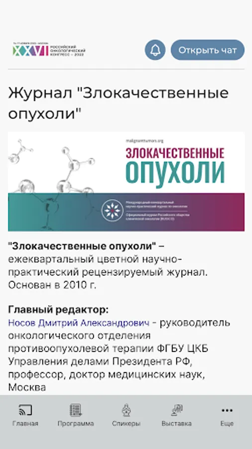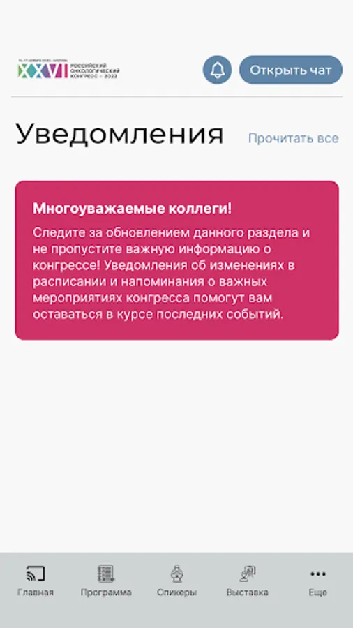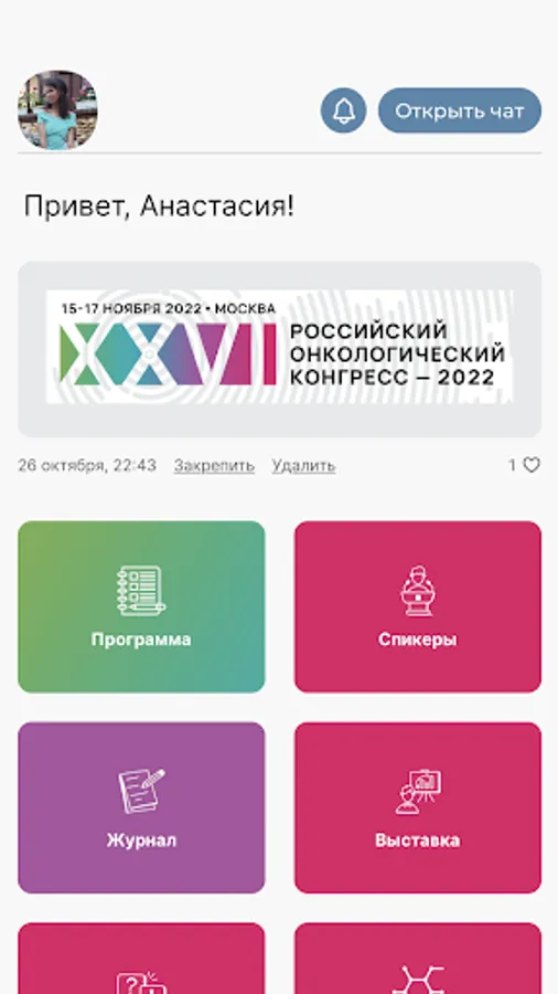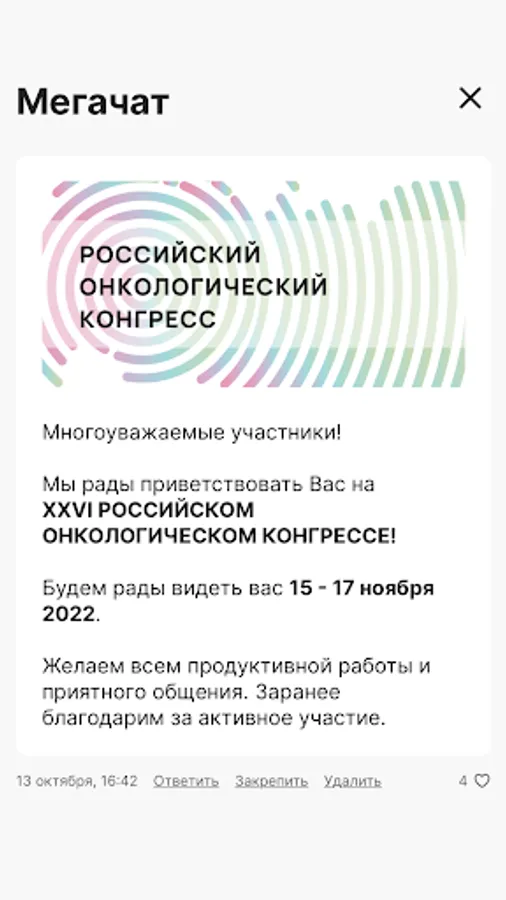 A free application developed specifically for the participants of the Russian Cancer Congress. The application provides an opportunity to receive real-time information about all the events of the event, provides feedback to the organizers and speakers, and also gives access to various interactive activities.