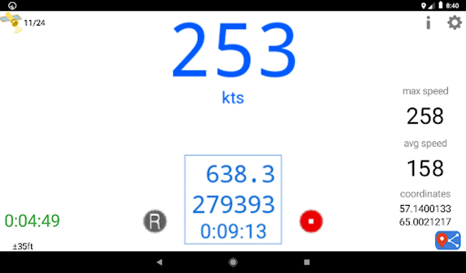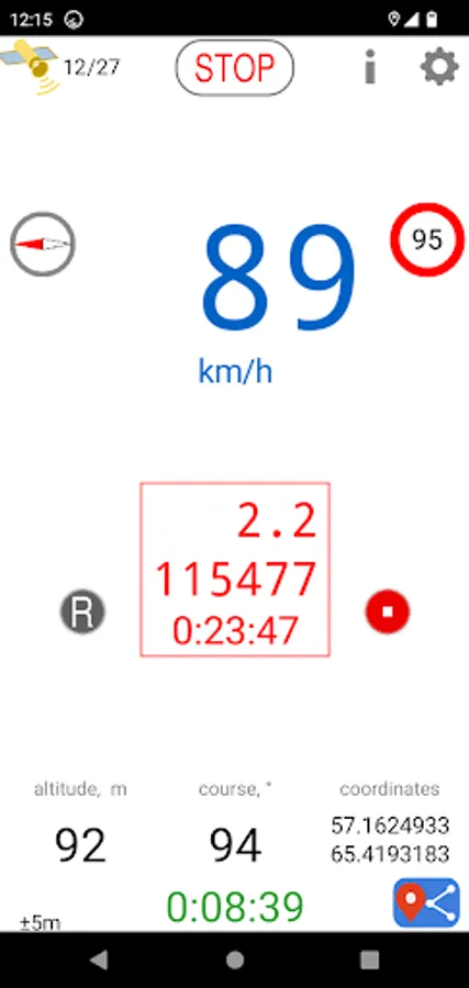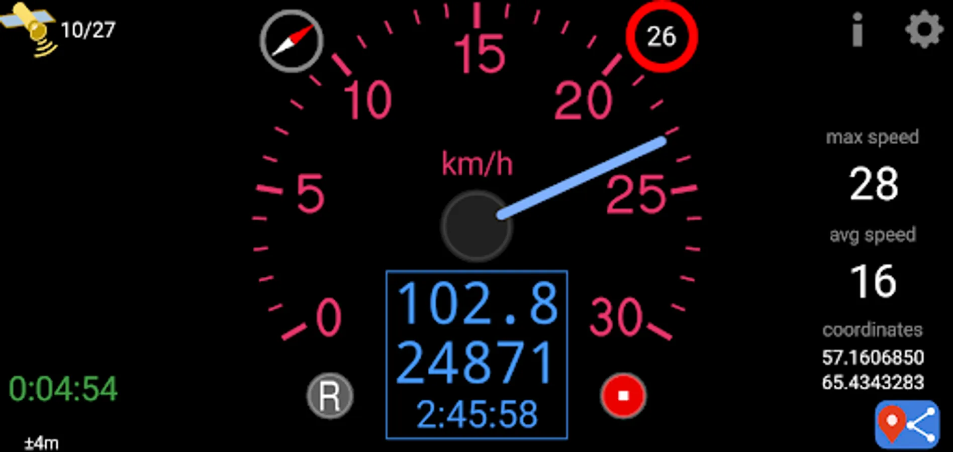 • Average speed in motion, maximum speed, altitude (above the WGS84 reference ellipsoid), course (using GPS/GNSS) and coordinates of the current location