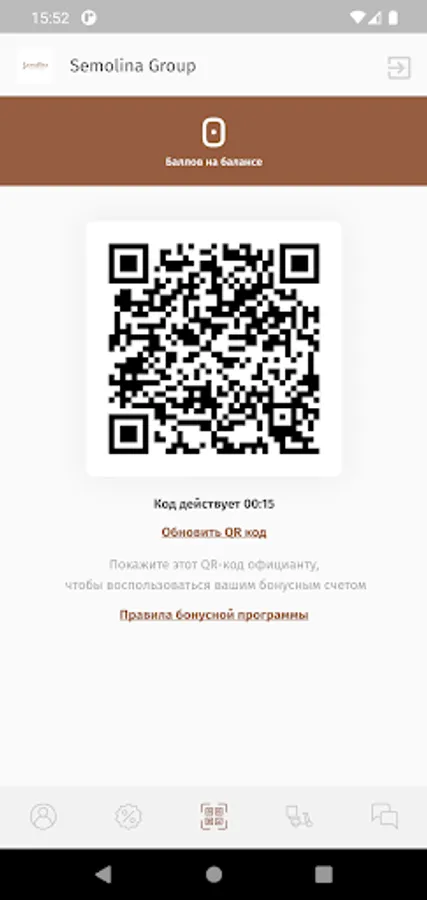 And with the help of the application, you can accrue or write off bonuses when ordering at the Semolina restaurant and find out how many bonuses are on your card. One bonus is equal to one ruble. You can also get a virtual bonus card. Download the mobile application, and we will give 300 rubles to your bonus account!