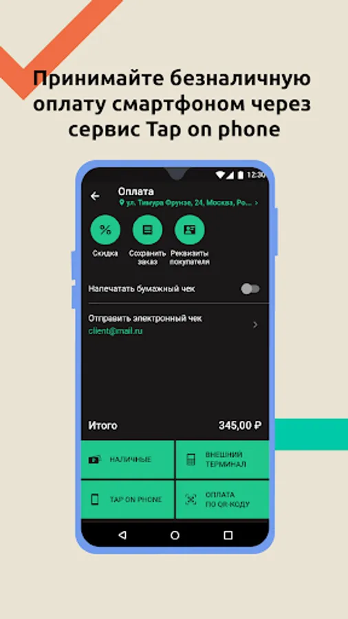 * To accept payments using Tap on phone, enable this payment method on your smartphone in the settings of the Mobile Cashier application. The system will prompt you to leave a connection request. After concluding an agreement with Sberbank PJSC, go through authentication and set the payment by Tap on Phone in the application settings on your smartphone.