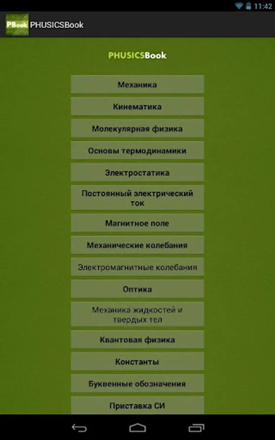List of Subjects: Quantum Physics, Constants, Symbolic, Optics, Electrostatics, Principles of thermodynamics, molecular physics, kinematics, Manual, Direct current, electromagnetic waves, magnetic field, mechanical vibrations, mechanics of fluids and solids, SI prefix, the Scheme.