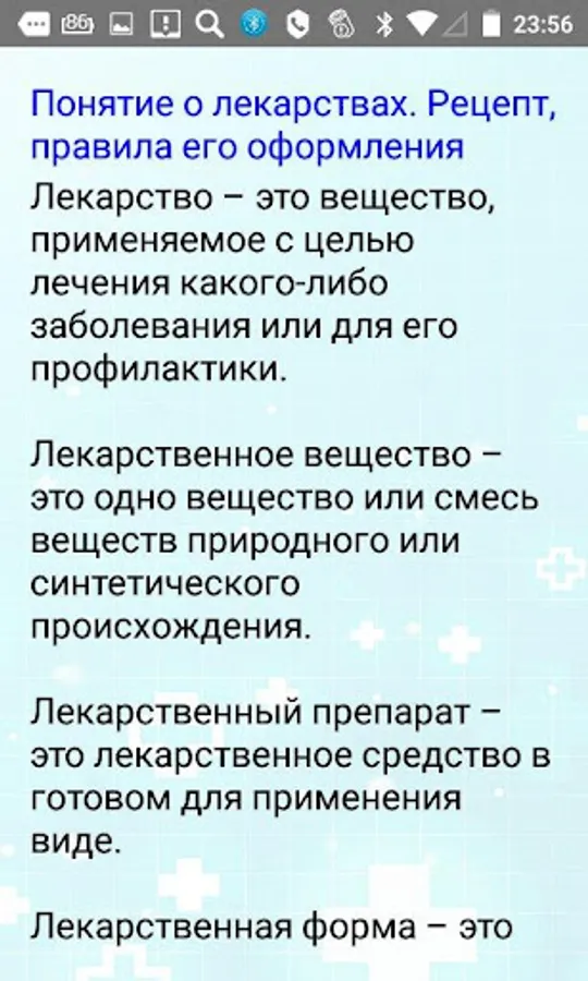 The introductory application General Medicine helps to prepare for recertification of practicing doctors studying in medical schools. Contains Biomedical disciplines, Medical and preventive disciplines, Clinical disciplines, etc. Topics are covered: Bioorganic chemistry; Human anatomy; Histology, embryology, cytology; Physiotherapy and medical supervision; Ophthalmology, etc. This is an introductory application, therefore a number of sections are limited.
