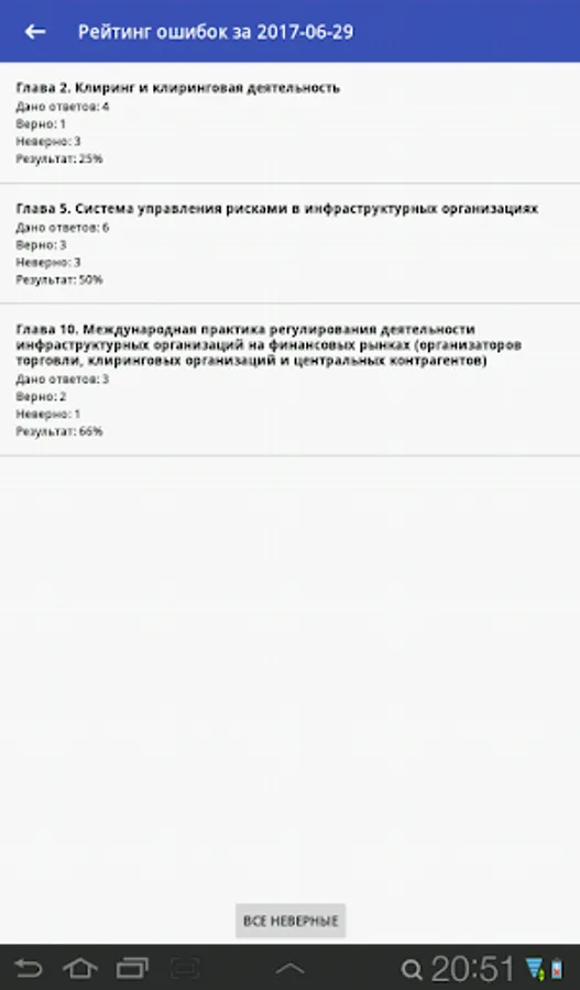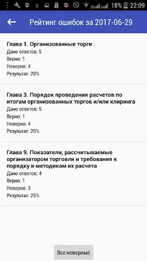 3. Statistics: the results of all the tests you pass (both in the training mode and in the exam mode) are saved, which allows you to further analyze the effectiveness of training both in the context of individual topics and by dates. You can view all the incorrect answers given by you, as well as try re-answering these questions.